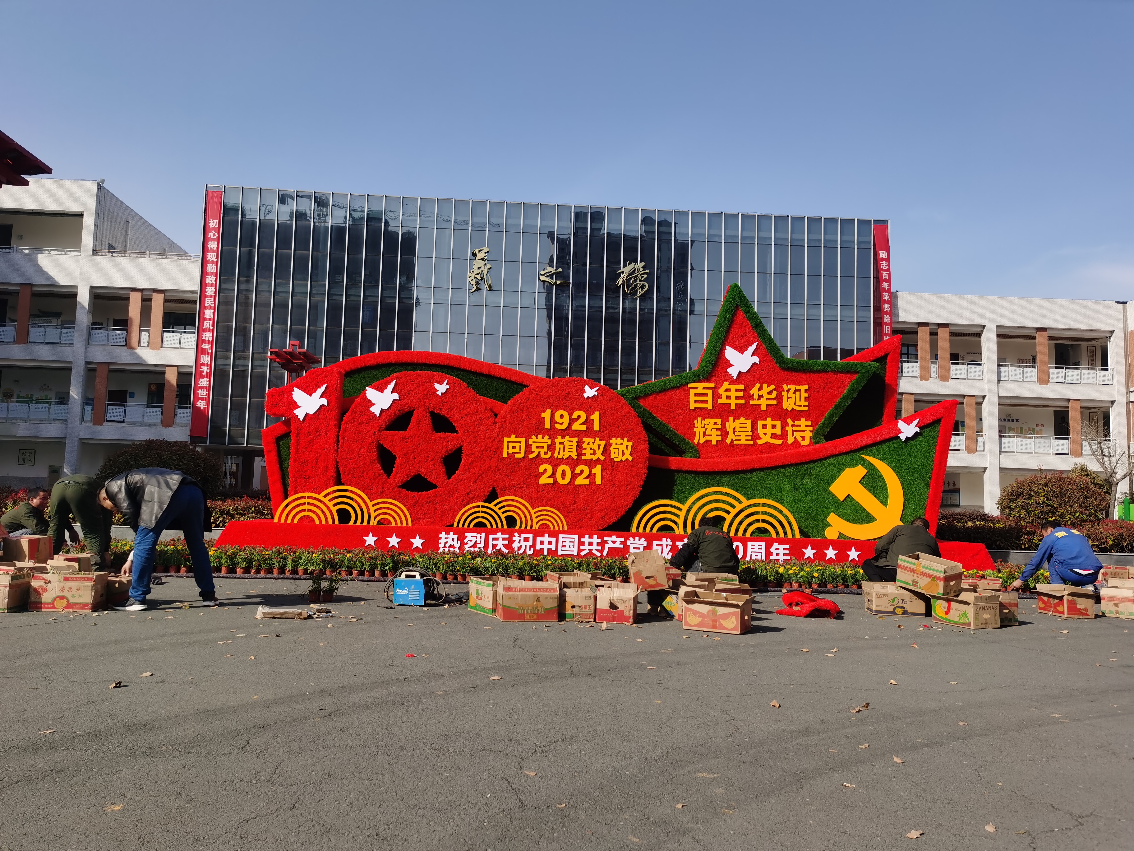 案例名稱:建黨100周年仿真綠雕工藝品走進(jìn)沭陽縣南湖小學(xué)